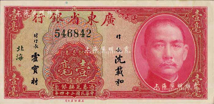 民国二十四年(1935年)广东省银行银毫券壹毫,无字轨,北海地名,九至九五成新