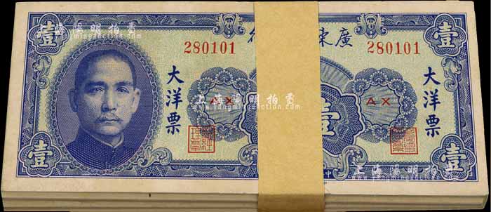 民国三十八年(1949年)广东省银行大洋票壹圆共100枚,除个别几枚有瑕疵外,整体约九八至全新,敬请预览