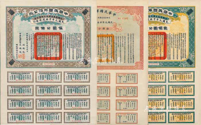 民国元年(1912年)中华民国军需公债伍圆、拾圆、壹佰圆共3种不同,为南京临时政府发行,由大总统孙文、副总统黎元洪、财政总长陈锦涛签名,均附带有完整息票;八五至九成新