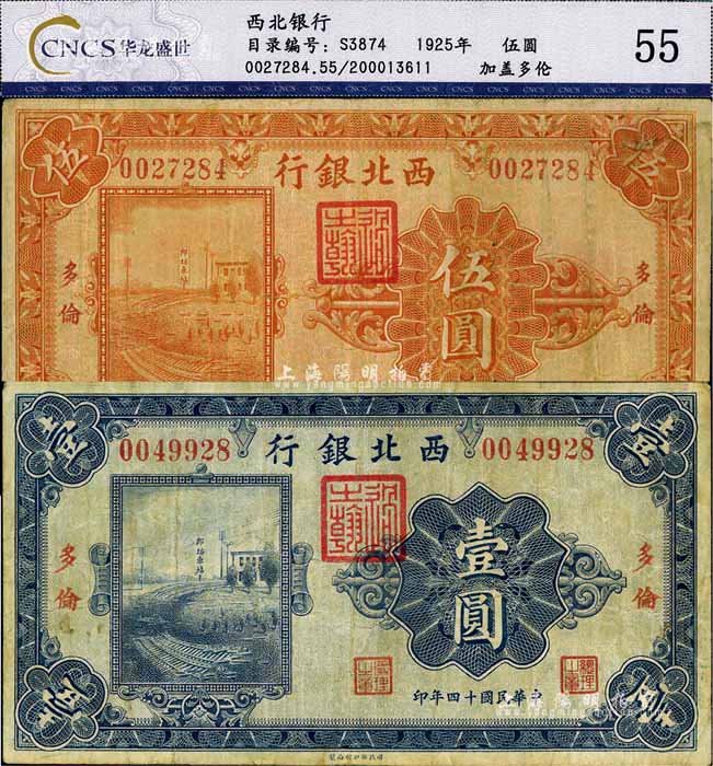 民国十四年(1925年)西北银行单色版壹圆、伍圆共2枚不同,多伦地名,自然七五成新