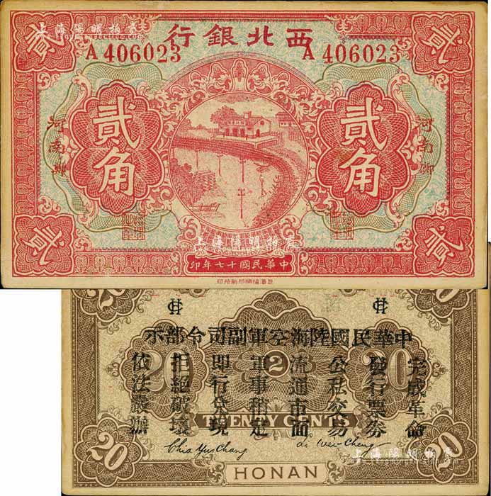民国十七年(1928年)西北银行贰角,河南·郑地名,背印“中华民国陆海空军副司令部示”,乃中原大战时代冯玉祥氏发行之军用钞票,未折九成新