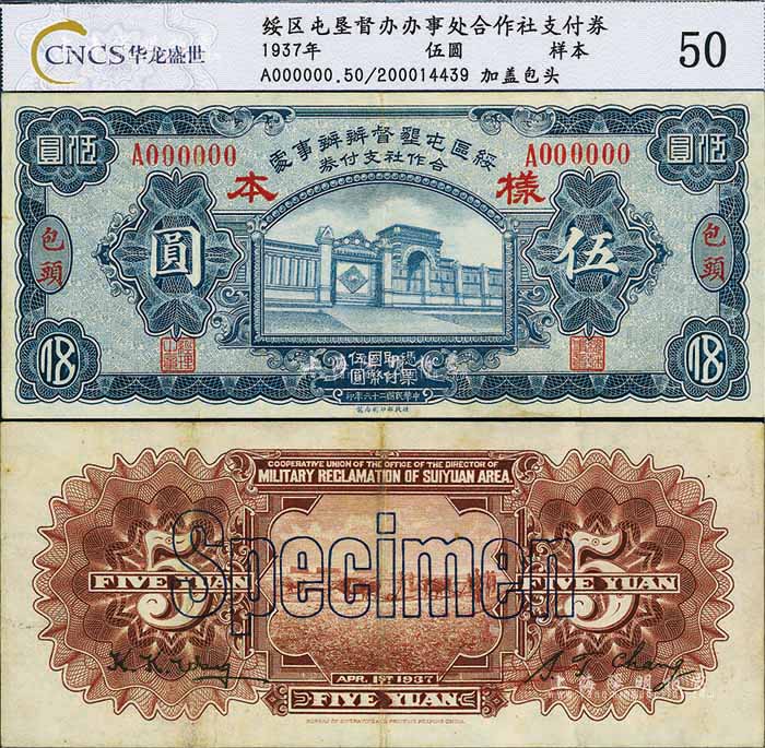 民国二十六年(1937年)绥区屯垦督办办事处合作社支付券伍圆样本券,正背共2枚,包头地名,乃晋军王靖国部发行之军用钞票;少见,八成新