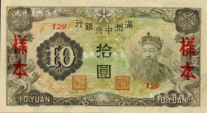 满洲中央银行丙改券(1944年)拾圆样本,短号129号(此种样本券所见均为127号,此129号券较为少见);美国藏家出品,全新