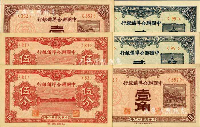 中国联合准备银行纸币6枚,详分:1939年伍分2枚、1940年壹角、贰角各2枚,九八至全新