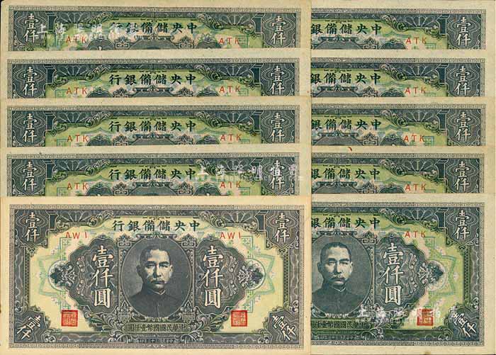 民国三十三年(1944年)中央储备银行长框短号壹仟圆共10枚,整体品相甚佳,九至九八成新