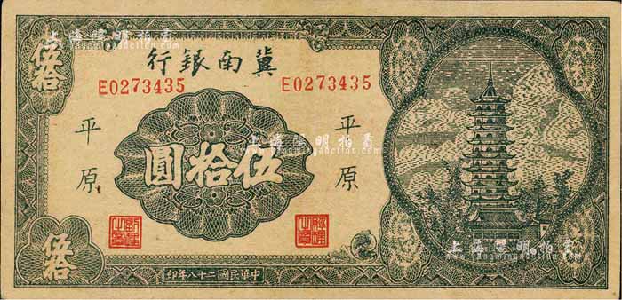 民国二十八年(1939年)冀南银行宝塔图伍拾圆,平原地名,九成新