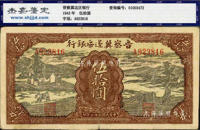 民国三十二年(1943年)晋察冀边区银行过河与牛耕地图伍拾圆,八成新