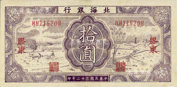 民国三十二年(1943年)北海银行紫色耕作图拾圆,胶东地名,双字轨,背印蓝色收割图;台湾藏家出品,九成新