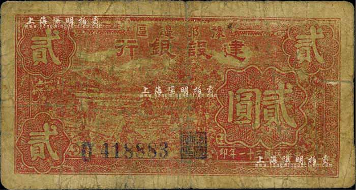 民国三十一年(1942年)豫鄂边区建设银行贰圆,自然近七成新