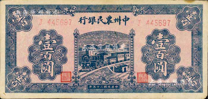 民国三十五年(1946年)中州农民银行壹百圆,八成新
