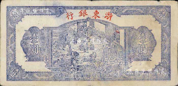 民国三十三年(1944年)浙东银行蓝色壹圆,行名小字版,近八成新