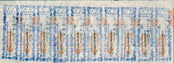 光绪三十一年(1905年)大连宏济彩票·第一次票整版大全张共10枚联体,由昔年大连八大富豪之一的刘肇亿氏所发行,其创办的宏济善堂曾是清末著名的慈善机构;珍罕品,八成新