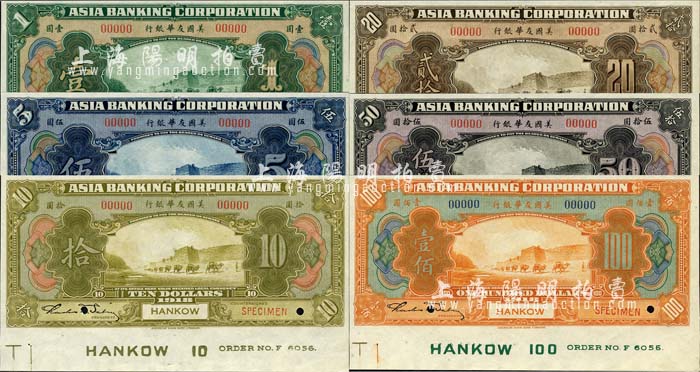 1918年美国友华银行壹圆、伍圆、拾圆、贰拾圆、伍拾圆、壹佰圆样本券共6枚大全套,汉口地名,正面下边均带有版铭;森本勇先生藏品,全新