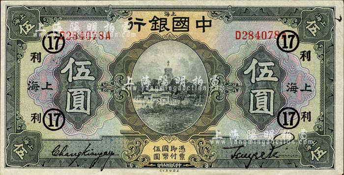 民国十五年(1926年)中国银行美钞版伍圆,上海地名,前后字轨,张嘉璈·贝祖诒黑色签名,加印领券“利·17”(代表恒利银行)字样;森本勇先生藏品,背有一处集藏贴痕,九成新