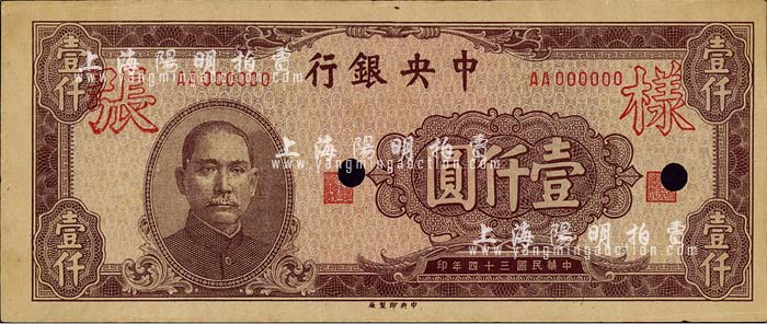 民国三十四年(1945年)中央银行中央厂棕红色壹仟圆样张,AA字轨,正背共2枚,背面注有“15版”字样;森本勇先生藏品,源于香港前辈名家卢志用先生之旧藏,近九五成新