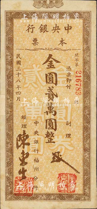 民国三十八年(1949年)中央银行本票(福州分行)金圆贰万圆,圆体号码版;森本勇先生藏品,源于日本前辈名家片冈裕(汤岛)之旧藏,七五成新