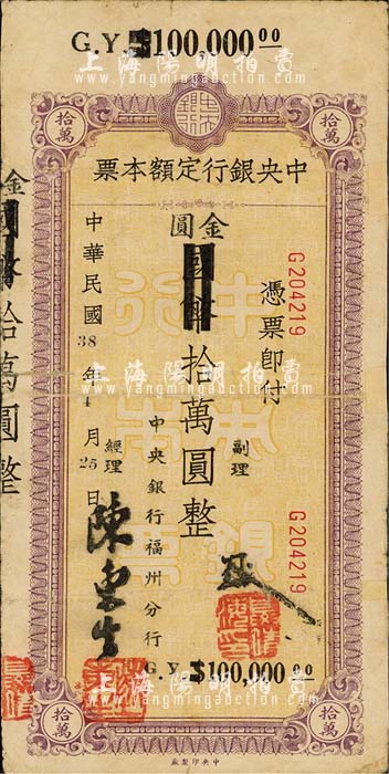 民国38年(1949年)中央银行定额本票(福州分行)国币改金圆拾万圆,中央印制厂印;森本勇先生藏品,源于日本前辈名家片冈裕(汤岛)之旧藏,边有贴补,七五成新