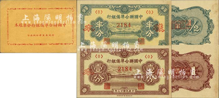 《中国联合准备银行分票样本》1册,行政委员会印刷局印,内含:民国廿七年版(1938年)半分、壹分样本券2种,正背共4枚;森本勇先生藏品,九八成新