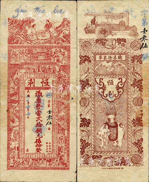 民国癸亥年(1923年)恒利·凭票发当贰拾铜元伍拾枚,江西瑞昌县钱庄钞票,上印古人对弈、二十四孝图及《治家格言》古文,背印太平有象、瓜瓞绵绵图,票幅宏大,极富传统内涵;森本勇先生藏品,少见,七五成新