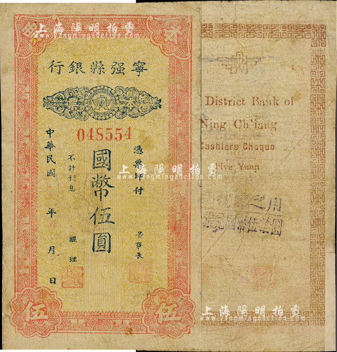 民国三十二年(1943年)宁强县银行本票国币伍圆,发行于抗战时代;森本勇先生藏品,源于日本前辈名家片冈裕(汤岛)之旧藏,罕见,边有贴补,七成新