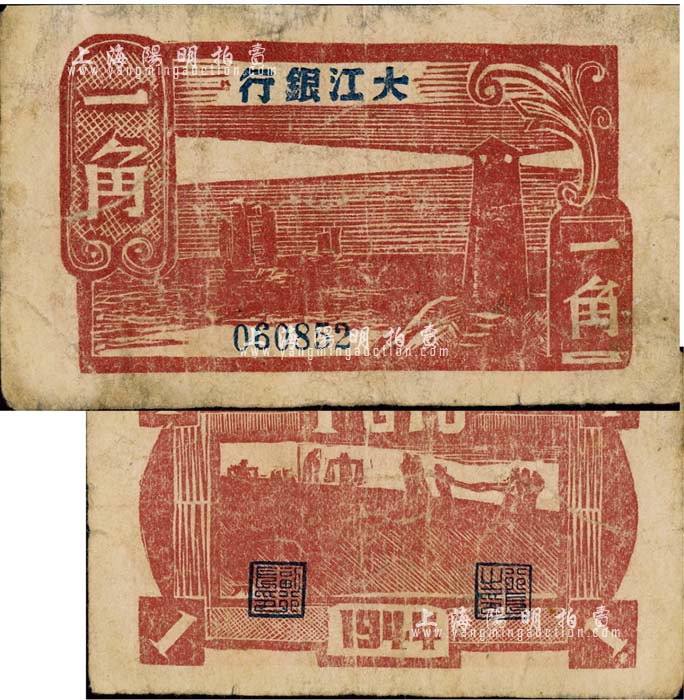 民国三十三年(1944年)大江银行木刻版一角,棕红色灯塔图;森本勇先生藏品,源于香港前辈名家卢志用先生之旧藏,少见,有小修补,七成新