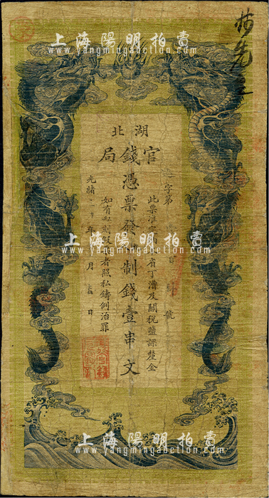 光绪三十年(1904年)湖北官钱局九八制钱壹串文,台湾藏家出品,有修补,七成新