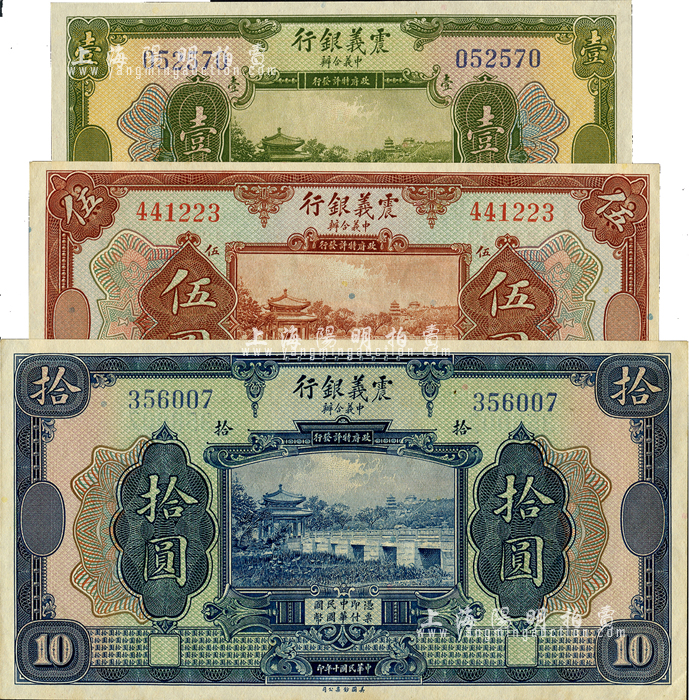 民国十年(1921年)震义银行壹圆、伍圆、拾圆共3枚全套,台湾藏家出品,九八成新