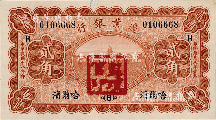 民国十八年(1929年)边业银行贰角,哈尔滨地名,加盖“监理官印”,日本回流品,九八成新