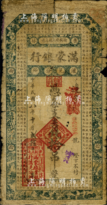 民国八年(1919年)满蒙银行吉钱拾吊,此乃满蒙殖业银行在吉林榆树县的汇兑分所发行,存世极为罕见;海外藏家出品,自然六五成新