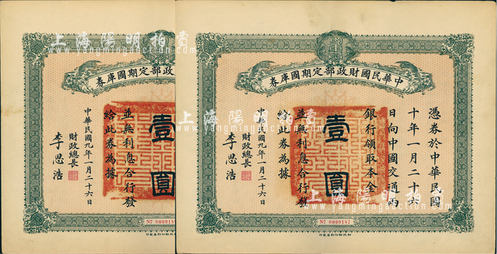 民国九年1月26日(1920年)中华民国财政部定期国库券壹圆共2枚连号,由财政总长李思浩(浙江慈溪人)签名,八五成新