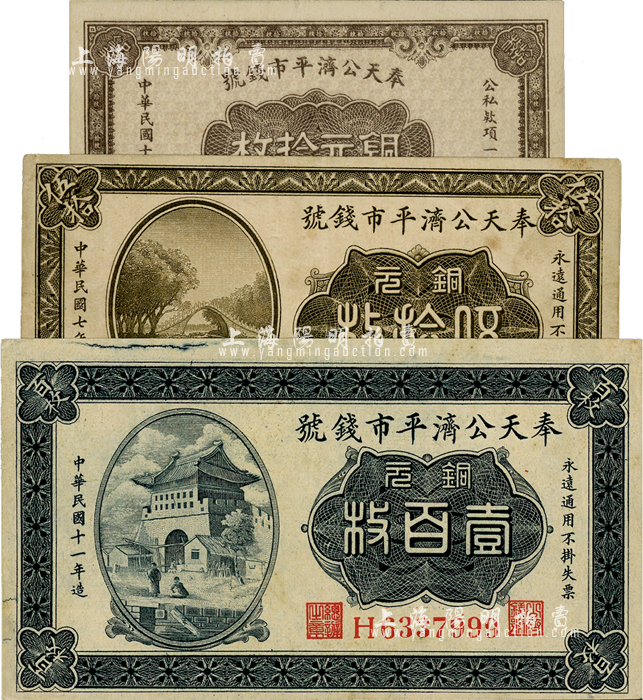 奉天公济平市钱号铜元票3枚,详分:1918年铜元伍拾枚、1922年雕刻版铜元壹百枚、1924年大号码铜元拾枚,八至九八成新