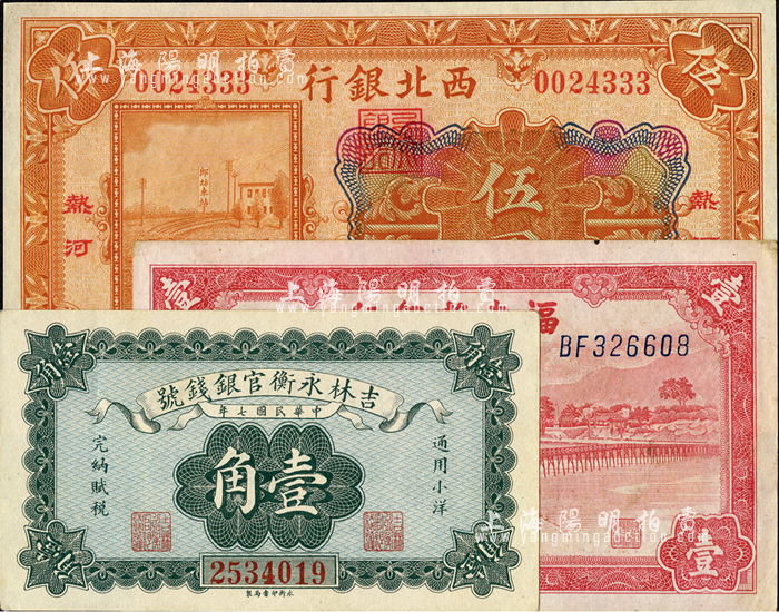 国钞3种,详分:吉林永衡官银钱号1918年小洋壹角;西北银行1925年多色版伍圆,热河地名;福建省银行1939年壹圆;海外回流,未折九五至九八成新