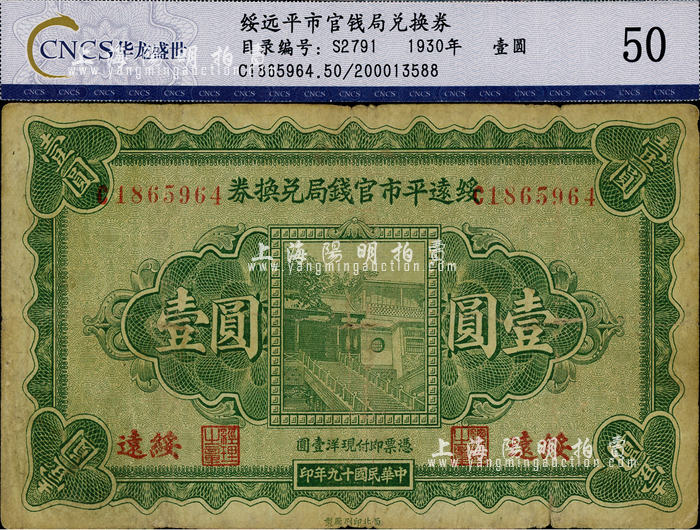 民国十九年(1930年)绥远平市官钱局兑换券壹圆,绥远地名,七成新