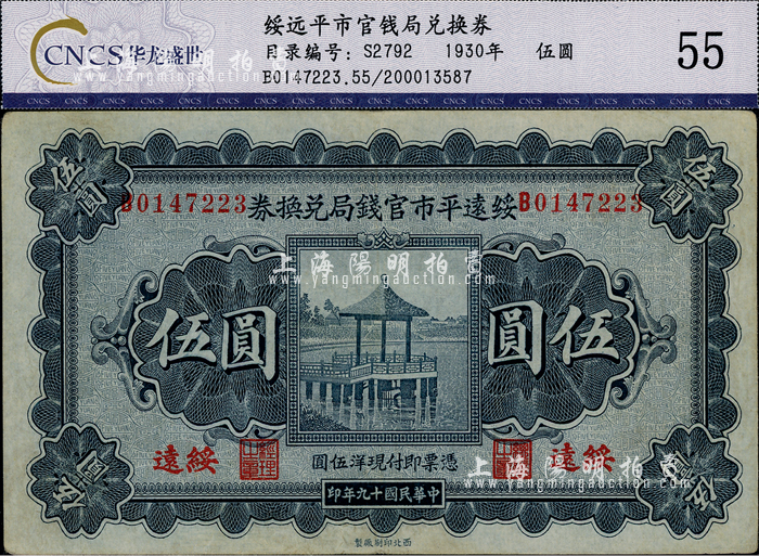 民国十九年(1930年)绥远平市官钱局兑换券伍圆,绥远地名,八成新