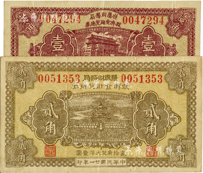 民国廿一年(1932年)获鹿财务局救济金融兑换券壹角、贰角共2枚不同,日本回流品,八成新