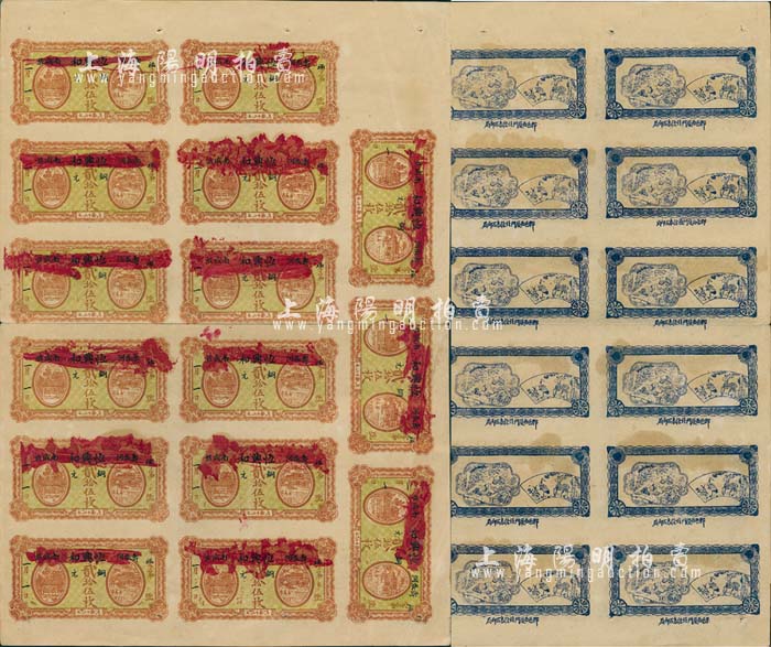 民国十九年(1930年)恒兴和铜元贰拾伍枚整版共15枚联体钞,山东寿张县钱庄钞票,背印和合二仙、鹤鹿同春图颇为美观;八五成新