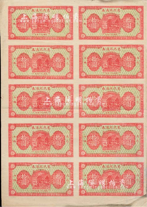 民国三十二年(1943年)昌邑西乡·惠民流通券拾圆整版共10枚联体钞,单面印制,八成新