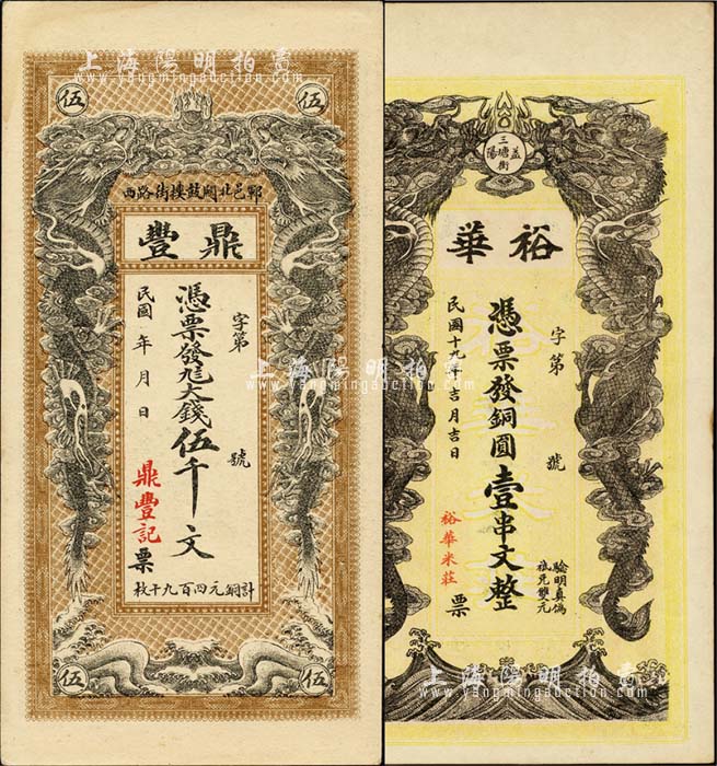 钱庄钞票2种,详分:(郓邑)鼎丰民国年大钱伍千文、(益阳)裕华1930年铜圆壹串文,均双龙戏珠图形制美观;台湾藏家出品,九五成新