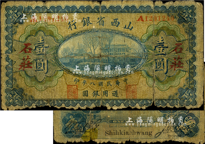 民国八年(1919年)山西省银行壹圆,石庄地名(即石家庄),A字轨7位号,少见,近六成新