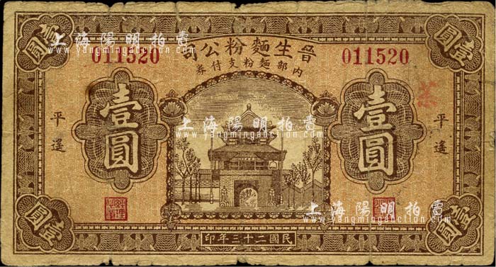 民国二十三年(1934年)晋生麵粉公司壹圆,平遥地名,该公司为近代晋商之著名民族企业,由平遥各票号集资所创办;品相自然,七成新