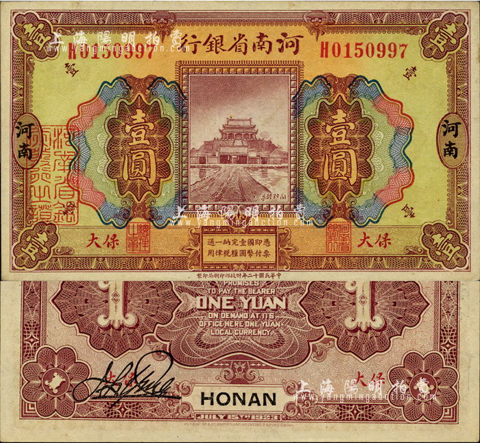 民国十二年(1923年)河南省银行壹圆,保大地名,其正背颜色与普通券不同;保大即保定、大名府之合称,此票乃具军用之性质;少见,未折九五成新