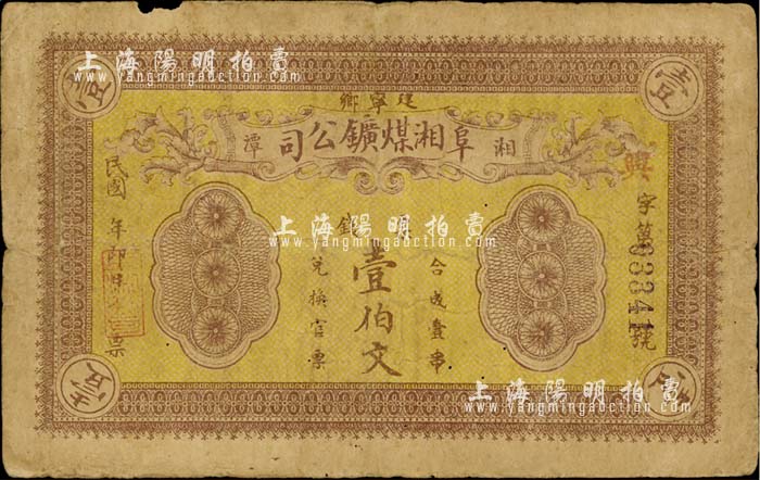 民国年(湘潭)阜湘煤鑛公司·票钱壹伯文,上海前辈藏家出品,少见,七成新