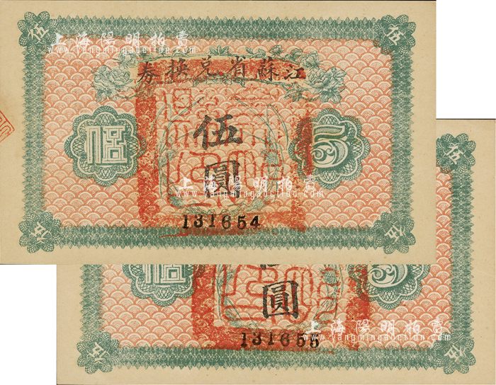 民国十四年(1925年)江苏省兑换券伍圆共2枚连号,正面均加盖“崇明县印”(今属上海),全新