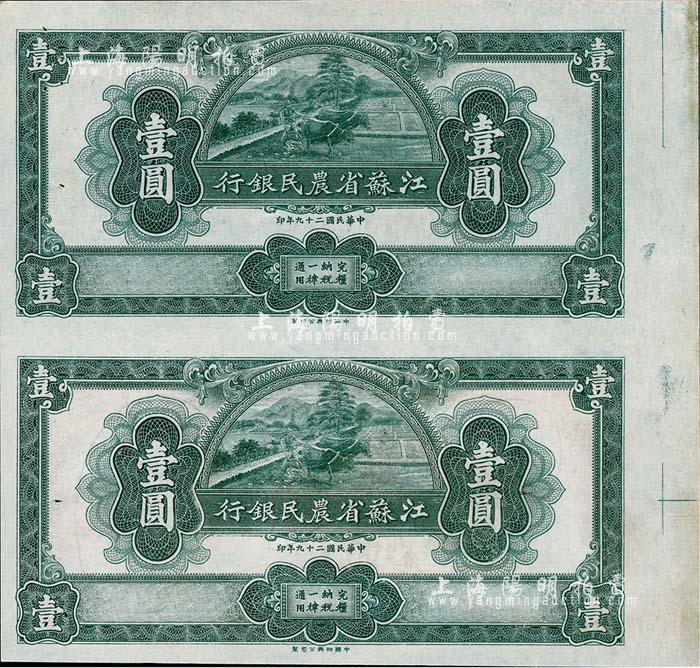 民国二十九年(1940年)江苏省农民银行裕兴版壹圆共2枚联体钞,有针眼,九五成新