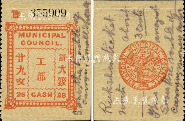 清末(上海)大英工部局代价券,面额计大钱廿九文,背印上海工部局标志,有水印;上海前辈藏家出品,少见,八成新