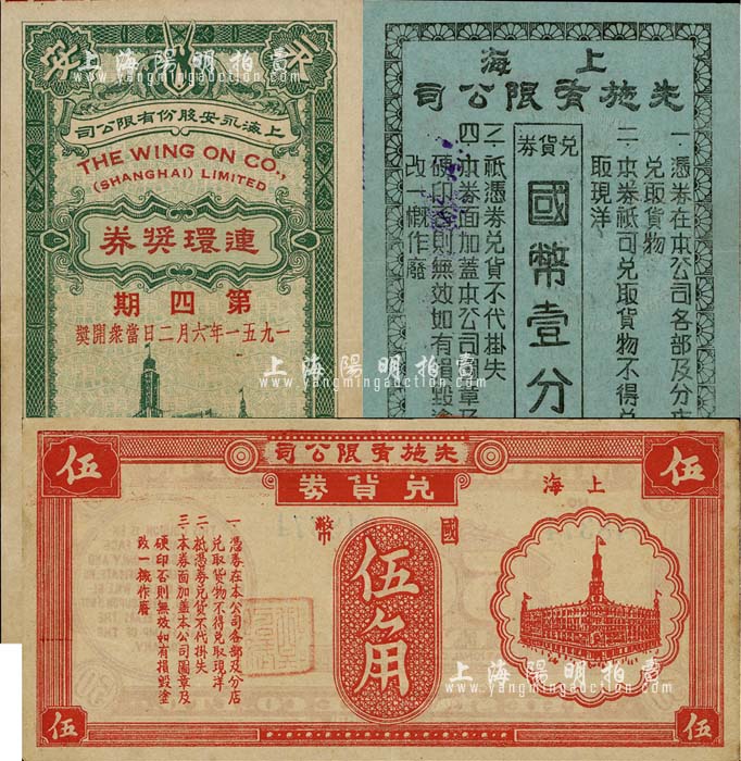 老上海百货业代价券等共3枚不同,详分:上海先施有限公司兑货券国币壹分、国币伍角;上海永安股份有限公司1951年第四期连环奖券;此二者均属老上海四大百货公司,上海前辈藏家出品,八至九成新