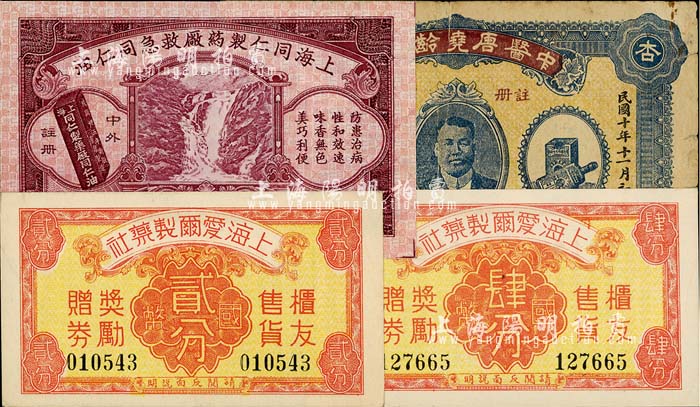 老上海药业代价券、辨真券共4种,详分:上海爱尔制药社国币贰分、肆分;中医唐尧龄药局1928年辨真券;上海同仁制药厂救急同仁油1946年辨真券;上海前辈藏家出品,七至九五成新
