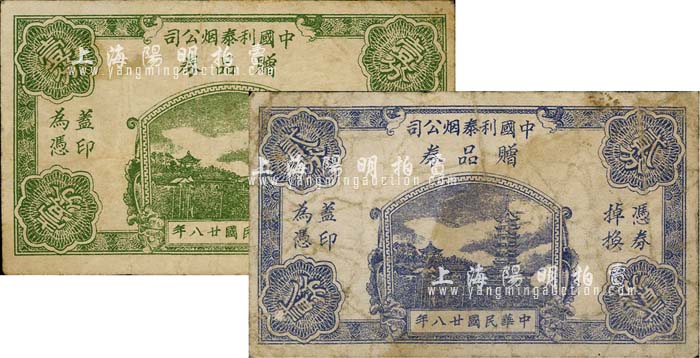 民国廿八年(1939年)中国利泰烟公司赠品券壹分、贰分共2枚不同;上海前辈藏家出品,七至七五成新