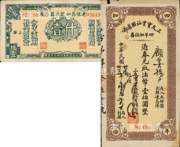 老上海孤岛时期代价券等2种,详分:老恒昌和记机器染厂壹什;三友实业社国药部四年加倍券1942年法币壹伯圆,此乃我国著名之民族国货企业,由宁波籍商人陈万运等创办于1912年;上海前辈藏家出品,八成新