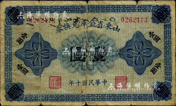 民国十年(1921年)山东省金库兑换券壹圆,少见品,唯惜中间已断开,但无缺损,五成新